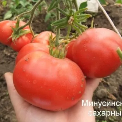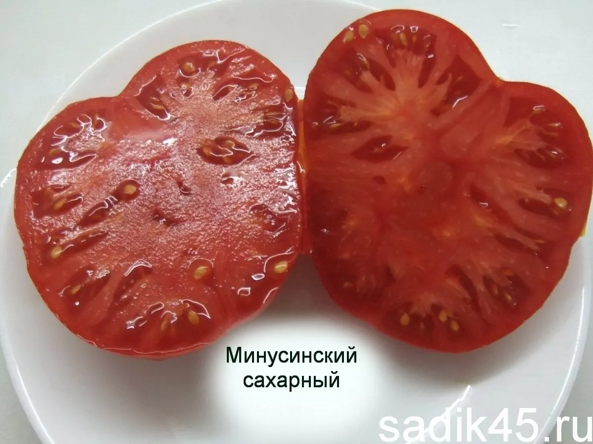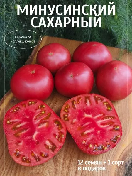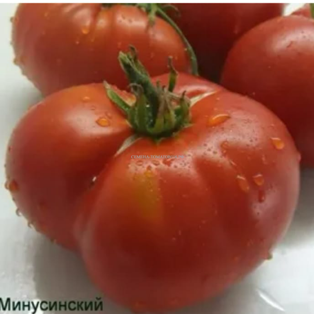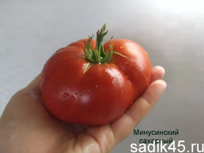 Плоды этого минусинского сорта обладают ярко выраженными сортовыми признаками, которые делают их узнаваемыми. Их главная визуальная черта — внушительные размеры и характерная приплюснутая, часто многокамерная форма, соответствующая заявленной плоскоокруглой. Ребристость у плодоножки выражена сильно, что придает томату старинный, «настоящий» вид.