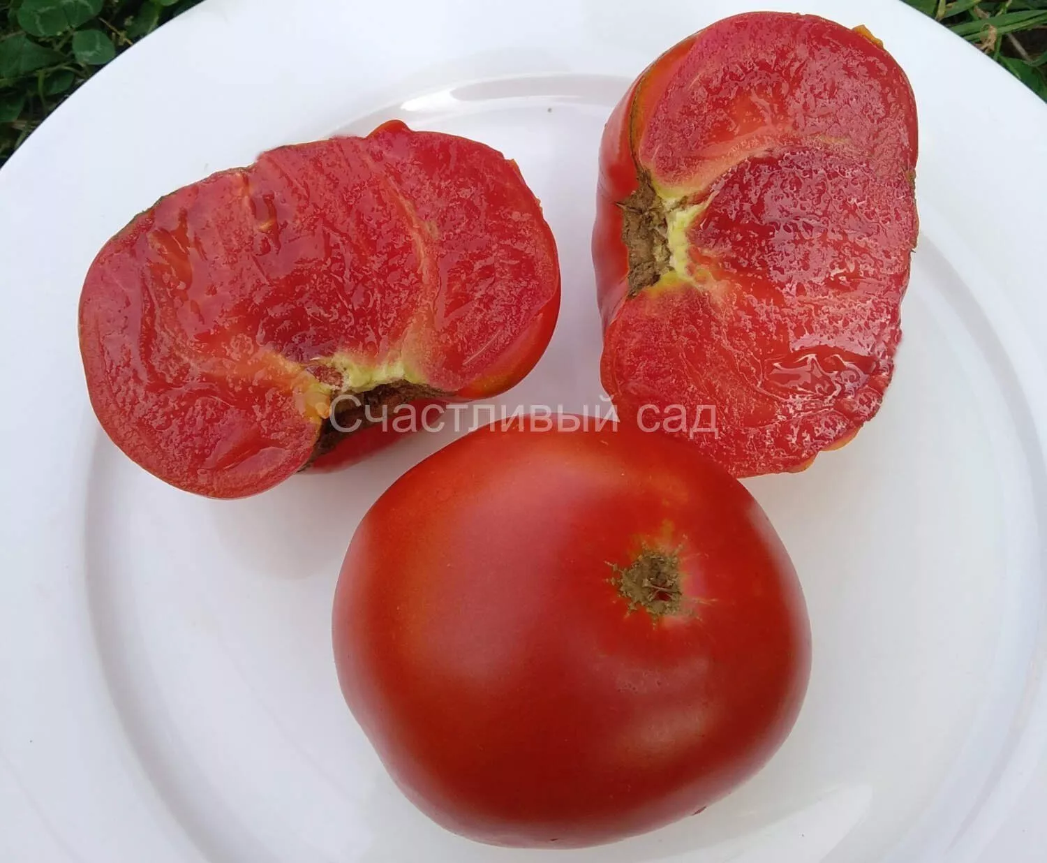 Кожица тонкая, но при этом плотная. Благодаря этому она не склонна к растрескиванию при стабильном, умеренном поливе, что является важным качеством для крупноплодного томата. Однако при резких перепадах влажности почвы риск все же существует.