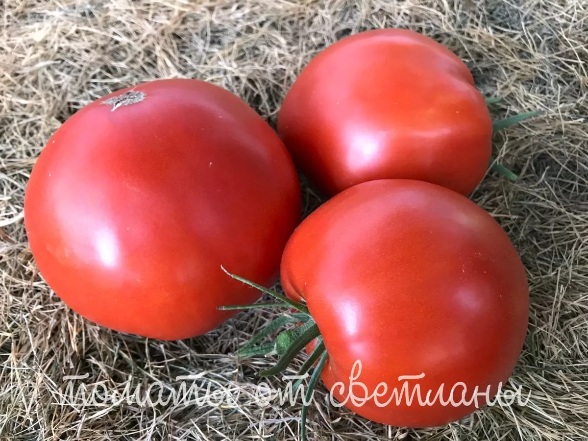 Внешний вид и структура плодов этого сорта являются его ключевой отличительной чертой. Томаты демонстрируют классическую, выровненную округлую форму, которая у наиболее крупных экземпляров часто становится слегка приплюснутой или даже слаборебристой. При полном созревании на кусте они приобретают равномерный, насыщенный красный цвет без зеленого пятна у плодоножки, что свидетельствует о качественном наливе.