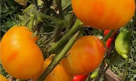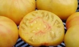 Окраска зрелого томата сложная и привлекательная. Основной фон – насыщенный желтый или оранжево-желтый. От плодоножки к плечикам расходятся более светлые, золотистые лучики и разводы, создавая эффект живописного «румянца». Полностью цвет проявляется только при биологической зрелости на кусте.