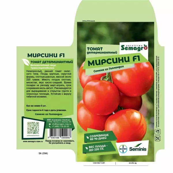 В плодах также содержатся витамины С, К, группы В, калий и пищевые волокна. Сочетание низкой калорийности с таким составом делает Мирсини отличным компонентом диетического и здорового рациона. Стабильный, сбалансированный вкус позволяет широко использовать эти томаты в детском и лечебно-профилактическом питании.