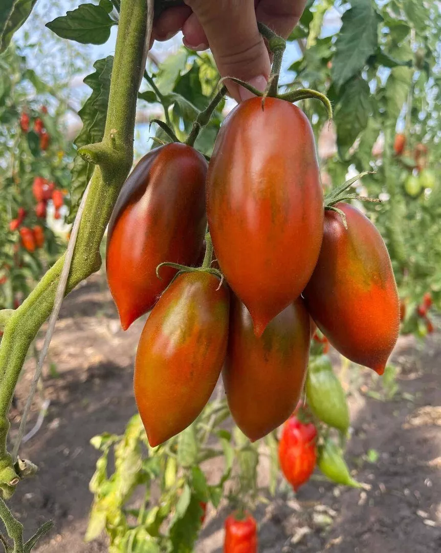 Главная отличительная черта этого гибрида — его плоды. Их форма является визитной карточкой сорта: выровненные, удлиненные цилиндры с аккуратным заостренным кончиком, так называемым «носиком». Такая геометрия не только придает томатам узнаваемый декоративный вид, но и имеет сугубо практическое значение для их основного назначения.