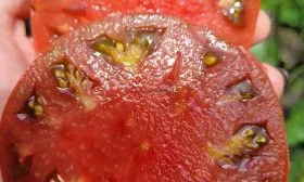 | Цвет зрелого плода | Темно-красный с фиолетовыми/шоколадными оттенками и зелеными плечиками | Уникальная окраска — визитная карточка сорта. Фиолетовый оттенок (антоциан) усиливается на солнце. Плечики могут оставаться зелеными даже у спелых плодов, поэтому главный признак зрелости — размягчение и насыщенный цвет основной поверхности. |