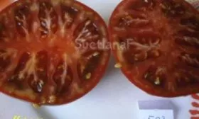 Мякоть соответствует внешнему виду — она мясистая, плотная и многокамерная, с небольшим количеством семян. На изломе она не сочится соком, а демонстрирует сахаристую, почти суховатую структуру, что характерно для сортов бифштексного типа.