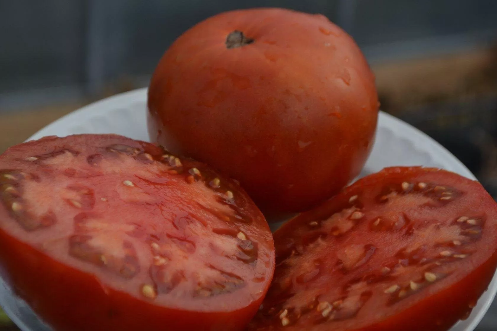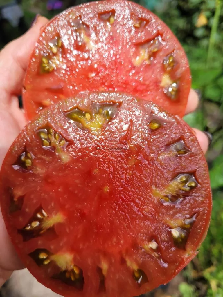 | Цвет зрелого плода | Темно-красный с фиолетовыми/шоколадными оттенками и зелеными плечиками | Уникальная окраска — визитная карточка сорта. Фиолетовый оттенок (антоциан) усиливается на солнце. Плечики могут оставаться зелеными даже у спелых плодов, поэтому главный признак зрелости — размягчение и насыщенный цвет основной поверхности. |