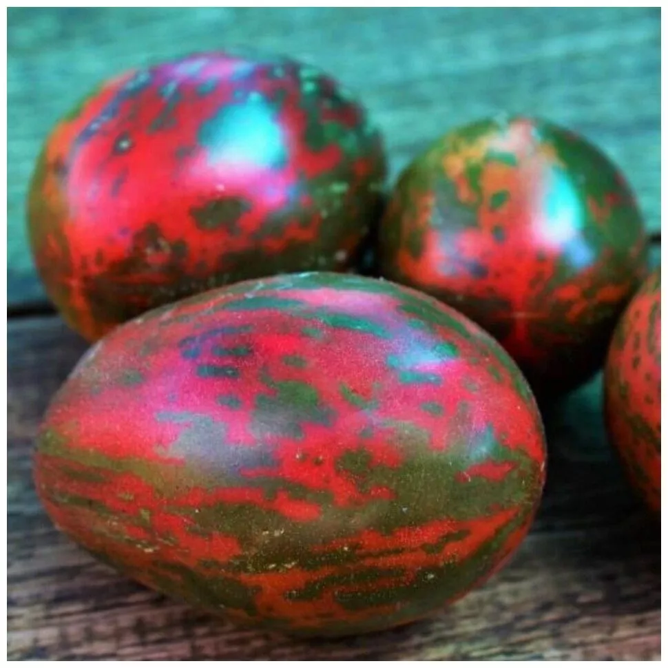 Главная отличительная черта сорта – его уникальная окраска. В фазе технической спелости плоды светло-зеленые с темно-зеленым пятном у плодоножки. По мере созревания основной фон наливается густым темно-красным, почти бордовым цветом. При этом контрастные зеленые штрихи и полосы, идущие от плодоножки к вершине, не исчезают, а лишь становятся немного темнее, создавая мраморный эффект.