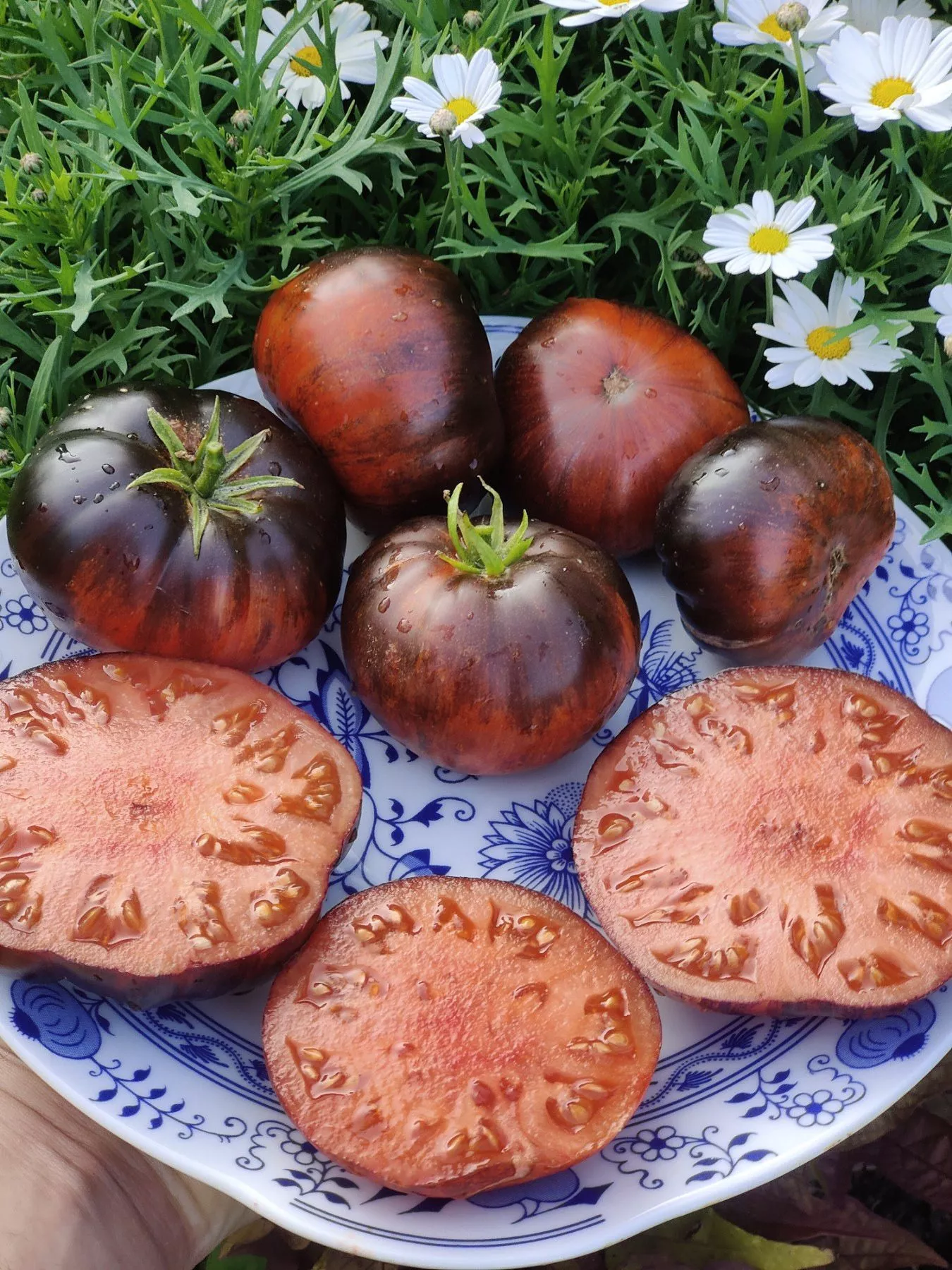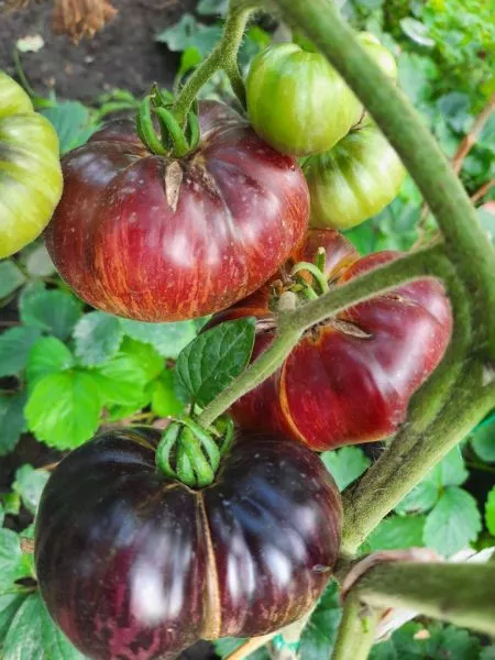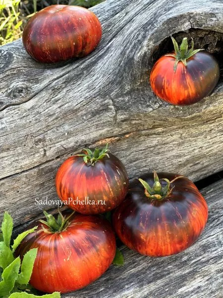 Последняя является визитной карточкой сорта. Желто-оранжевый основной цвет плода в сочетании с красно-синими, почти черными плечиками – это проявление антоциановой пигментации. Такие сорта часто называют «биколорами» (двухцветными) с антоциановым напылением. Их популярность зародилась в США и Западной Европе, откуда семена и начали распространяться по миру среди коллекционеров.