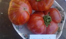 Визуальная отличительная черта этого сорта — особая текстура поверхности плодов. Зрелые помидоры имеют классический красный цвет, но их кожица лишена характерного для большинства сортов глянцевого блеска. Она обладает выраженной матовостью и легкой бархатистостью, что создает уникальный эффект мраморной или замшевой фактуры. Форма плодов плоскоокруглая, часто с заметной ребристостью в области плодоножки.