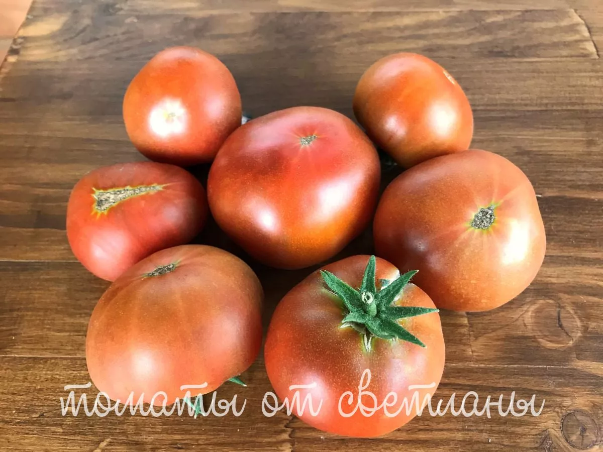 Плоды плоскоокруглой формы массой 180-230 граммов обладают уникальным красно-коричневым цветом, который указывает на наличие антоцианов. Эти природные пигменты не только придают необычную окраску, но и могут повышать антиоксидантные свойства томата.