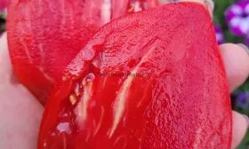 Главный козырь сорта — это вкус. Мякоть мясистая, сахарная на изломе, с очень небольшим количеством кислоты и ярким, сбалансированным вкусом, который часто описывают как десертный. Семенных камер немного, основную массу плода составляет плотная, сочная мякоть с высоким содержанием сухих веществ.