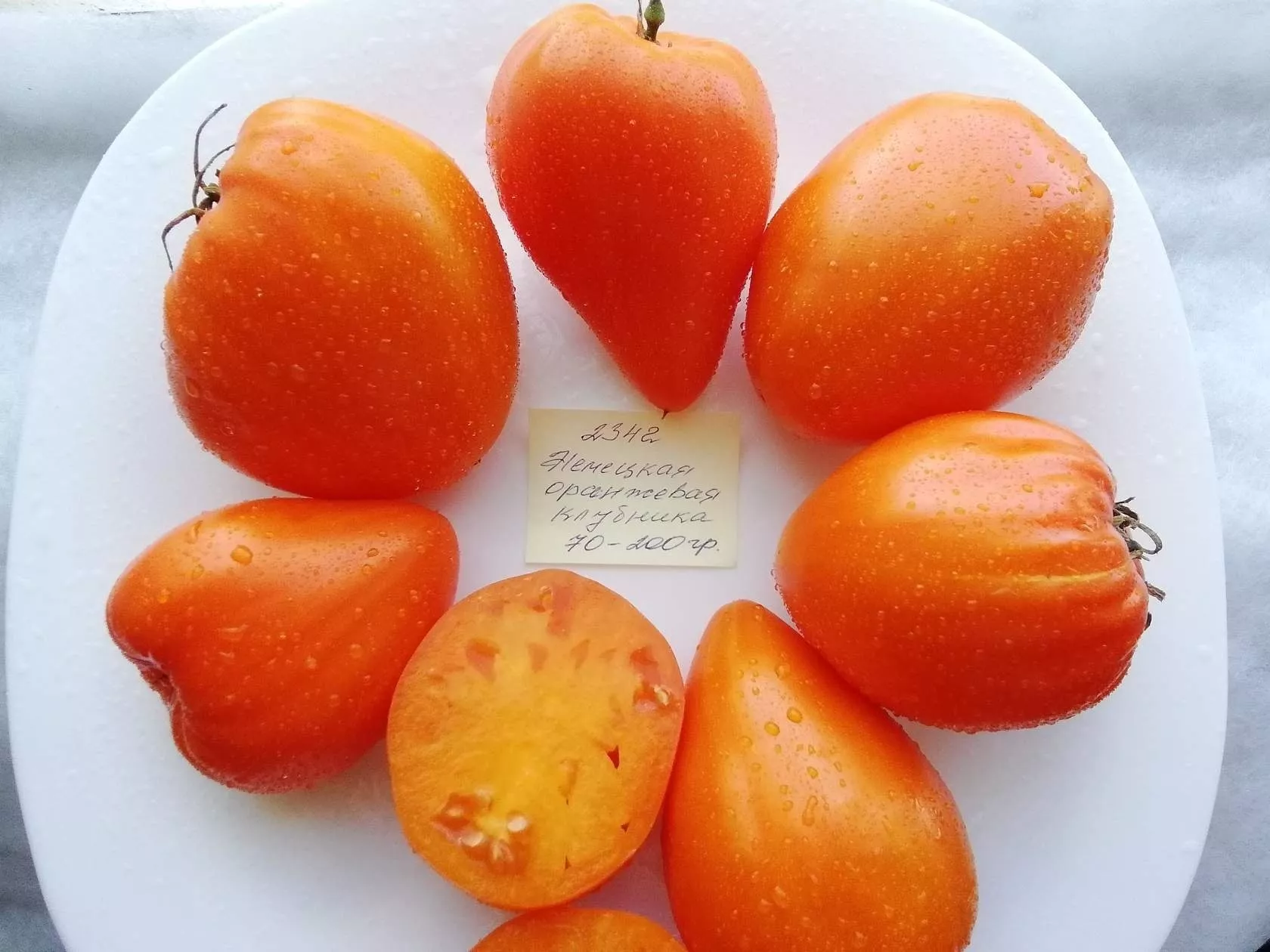 Плоды имеют узнаваемую сердцевидную форму с выраженной ребристостью у плодоножки, что и дало сорту название «клубника». Их главный внешний маркер — ярко-оранжевый цвет в биологической спелости, свидетельствующий о высоком содержании бета-каротина. Созревание происходит постепенно: от зеленого через стадию бледно-оранжевого (молочную спелость) к насыщенному тону.