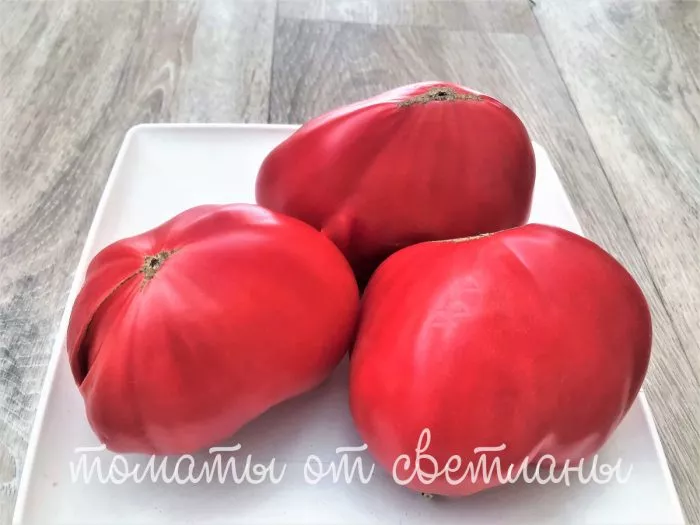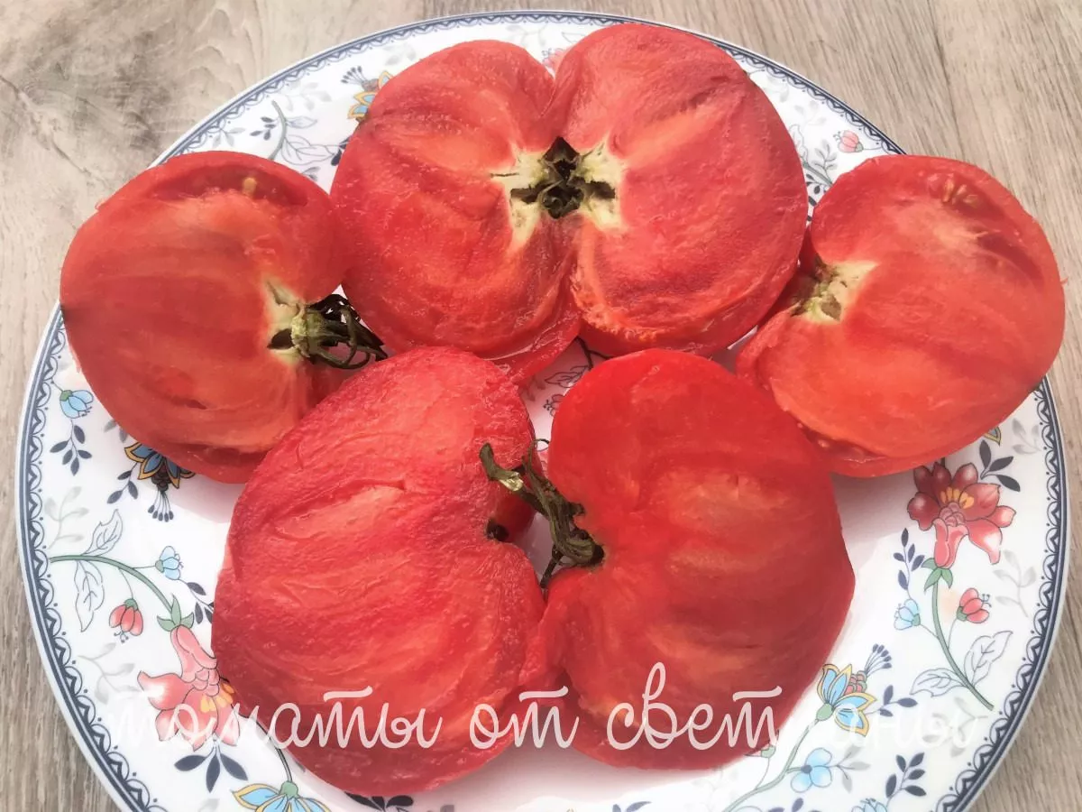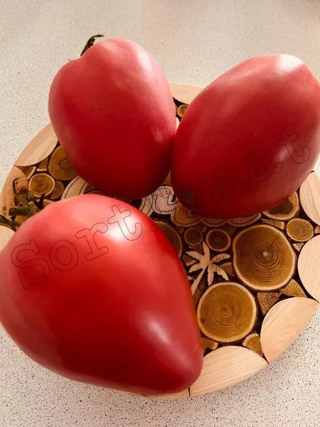 Средняя масса плода колеблется от 350 до 600 граммов, а первые, самые нижние помидоры могут быть и крупнее. Мякоть очень мясистая, сахаристая на изломе, с небольшим количеством семян и нежной, тонкой, но прочной кожицей.