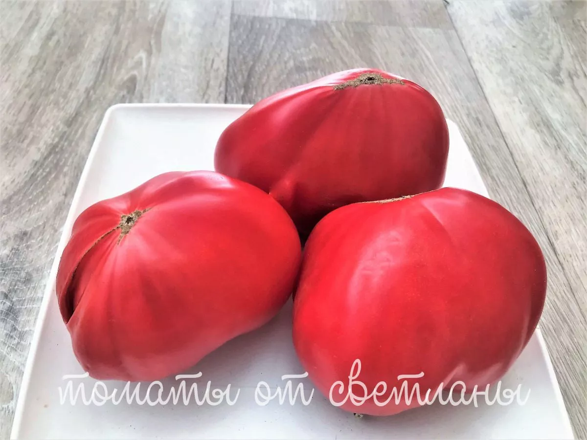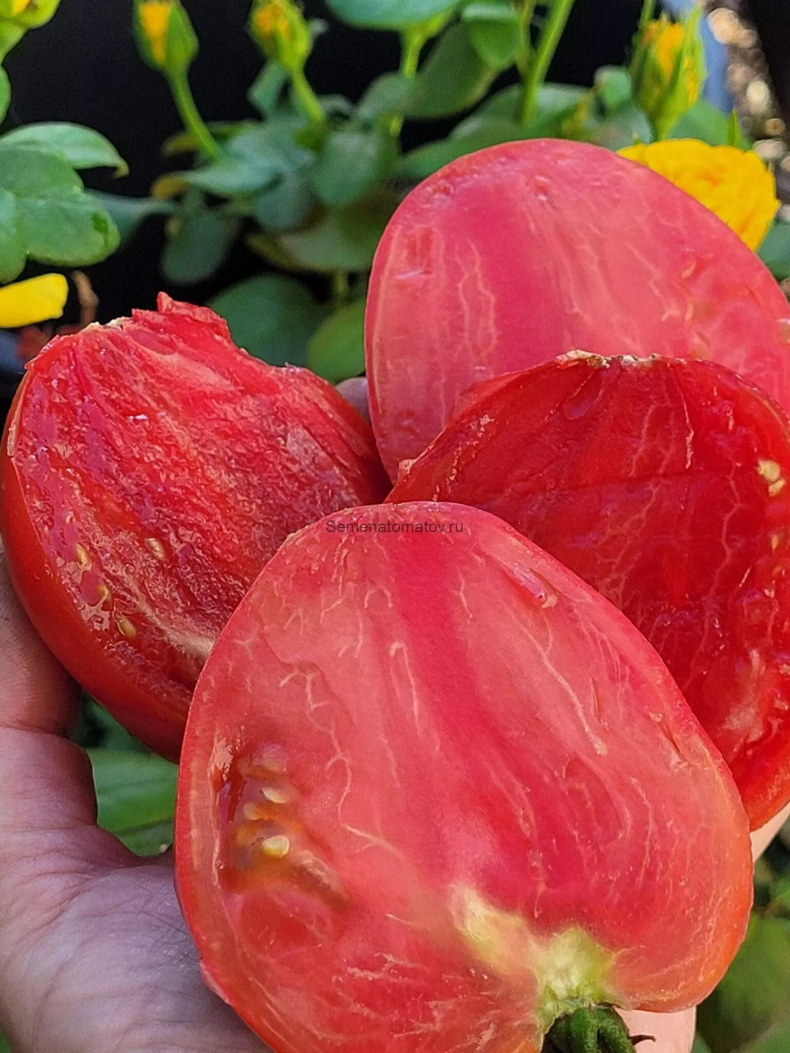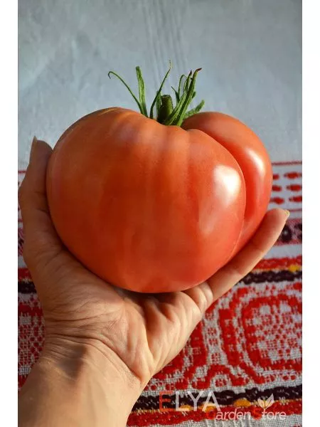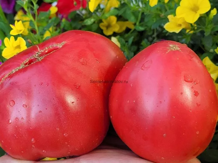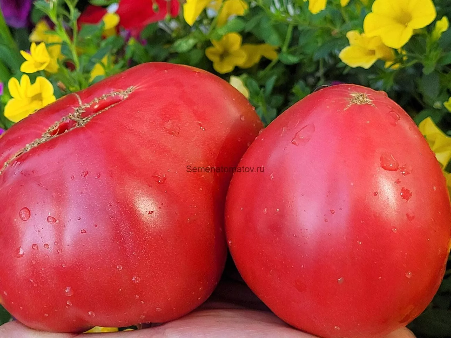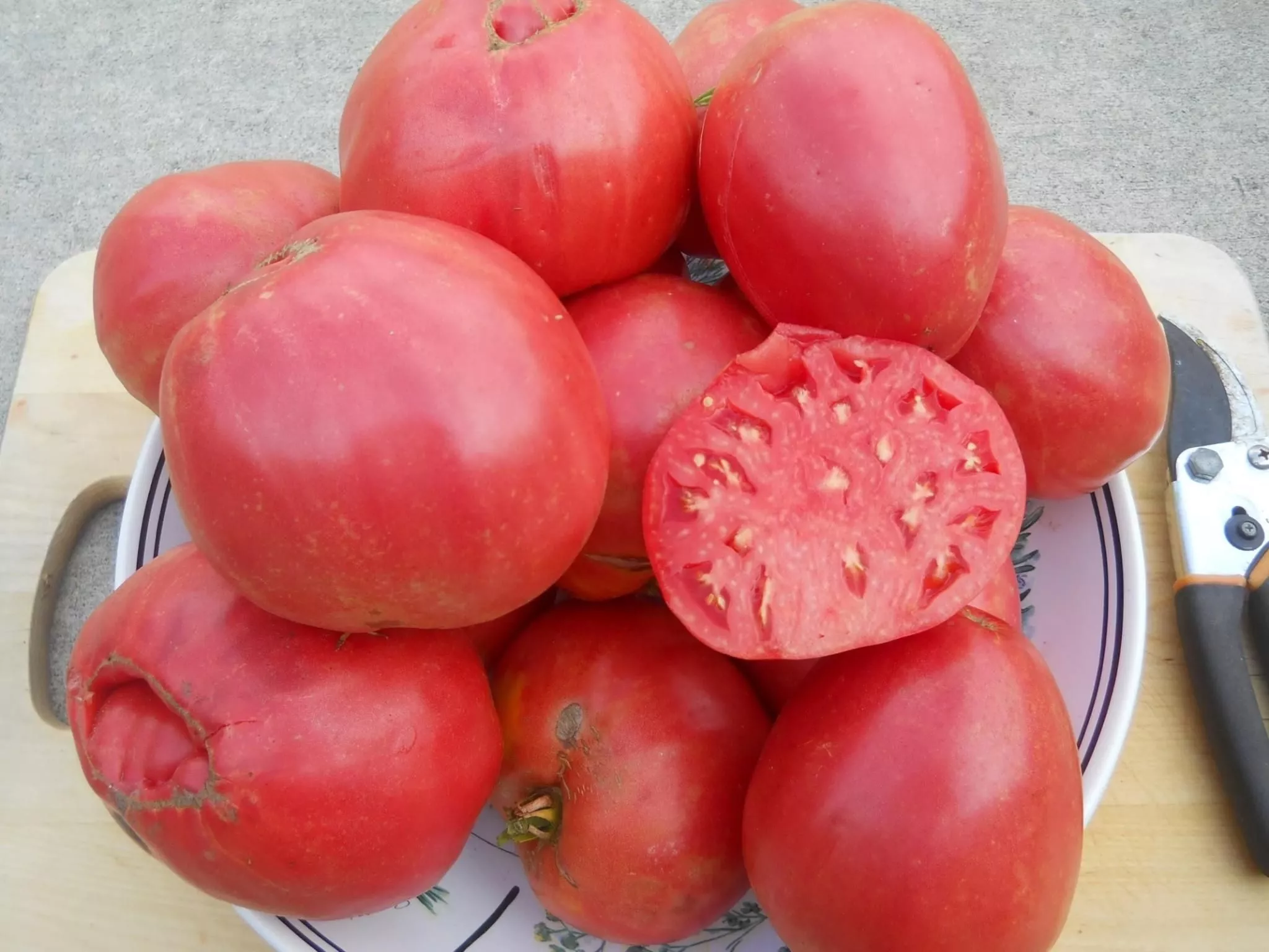 Но истинная гордость этого томата — это, конечно, его плоды. Они имеют характерную слегка сердцевидную форму с тупым, аккуратным носиком на вершине. В стадии полной зрелости томаты приобретают насыщенный розовый цвет без зеленого пятна у плодоножки.