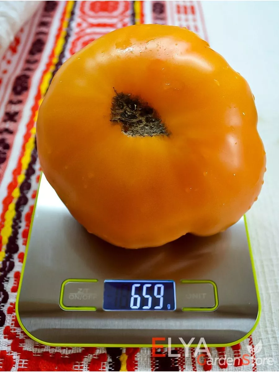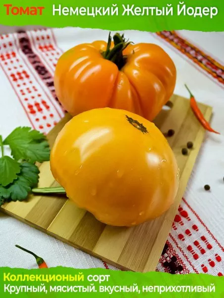Именно плоды являются визитной карточкой Немецкого жёлтого Йодера. Их форма классифицируется как плоскоокруглая. Часто у плодоножки наблюдается выраженная ребристость, которая придает томату особый, «фактурный» вид. Полностью созревшие плоды приобретают равномерный золотисто-желтый цвет, иногда с теплым янтарным оттенком, без зеленых пятен у плодоножки.