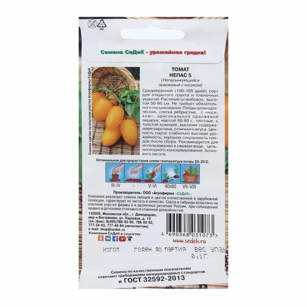 Каждый сорт в линейке имеет свой номер и уникальные характеристики плодов. Непас 5, или «Непасынкующийся оранжевый с носиком», выделяется своей яркой оранжевой окраской и оригинальной эллиптической формой с выраженным носиком. Такая форма не только придает плодам узнаваемый вид, но и часто связана с плотной мякотью, что подтверждает его техническое назначение для переработки.