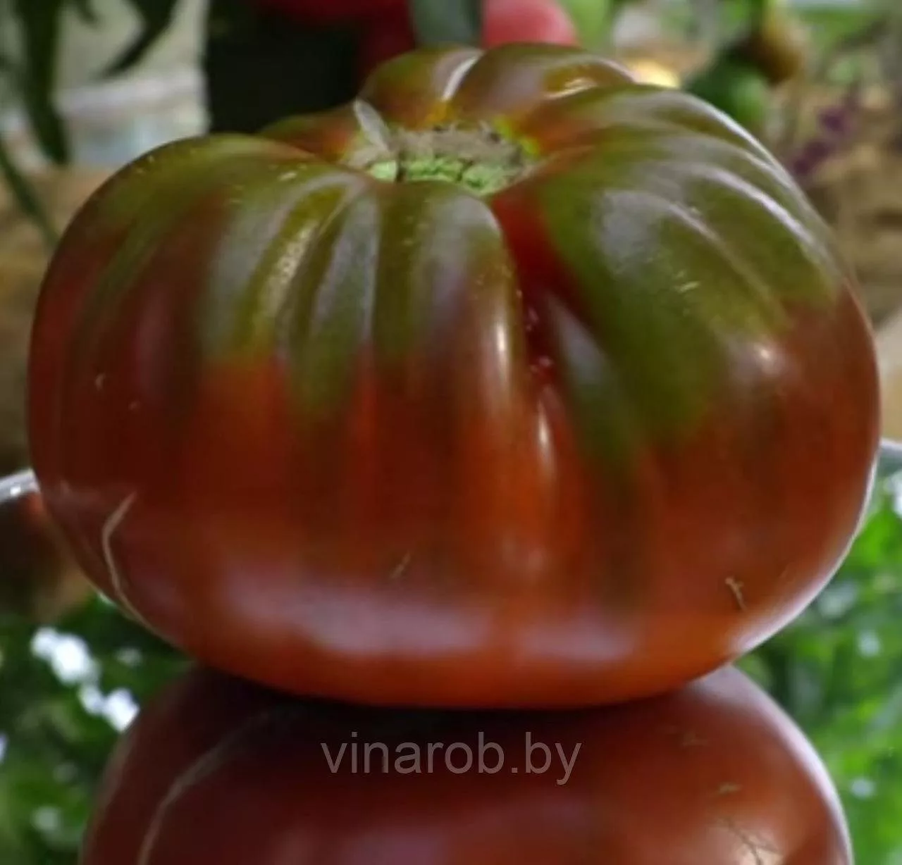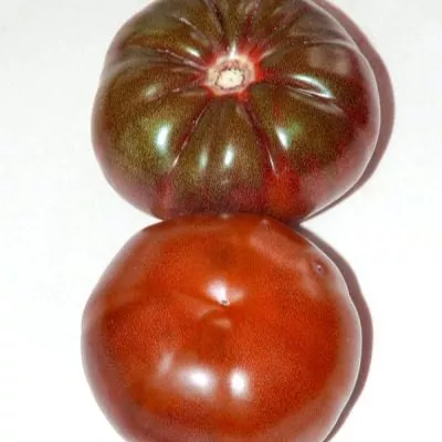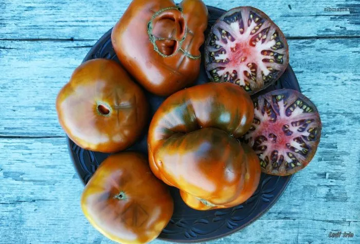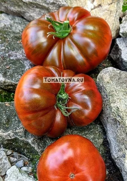 Его уникальная окраска — коричнево-пурпурная с темно-зелеными плечиками — сразу относит его к группе так называемых «черных» или биколорных томатов. Интенсивный цвет формируется за счет сложного наложения нескольких пигментов: антоцианов (придающих фиолетовые и пурпурные оттенки), каротиноидов (желто-оранжевая гамма) и сохраненного у плодоножки хлорофилла (зеленый цвет).
