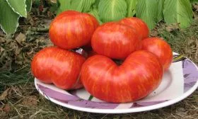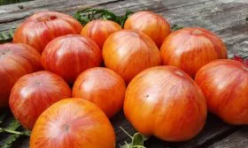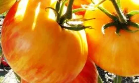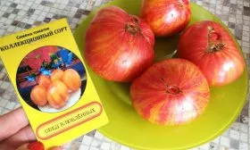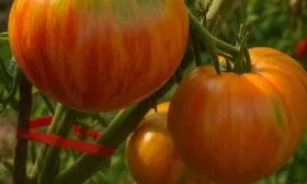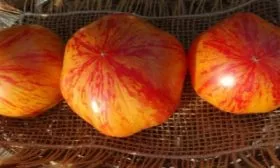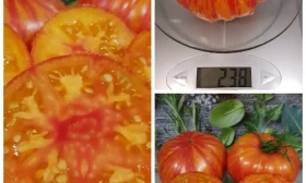 Главная особенность, выделяющая этот сорт среди сотен других, — эксклюзивная окраска плодов. Сочетание нежно-оранжевого фона с золотистыми разводами и розовыми полосками делает каждый помидор неповторимым произведением искусства. Эта сложная игра цвета не только визуально привлекательна, но и является маркером сортовой принадлежности.