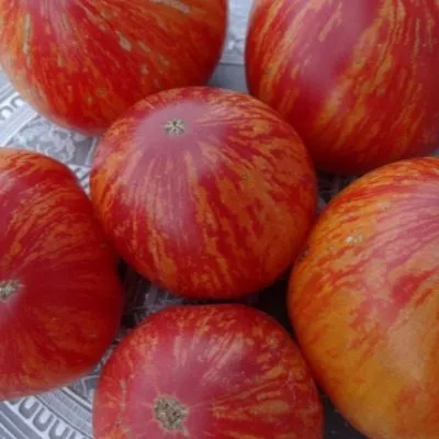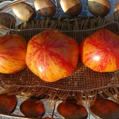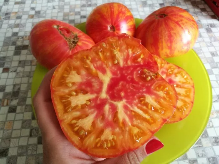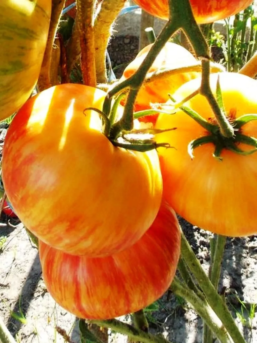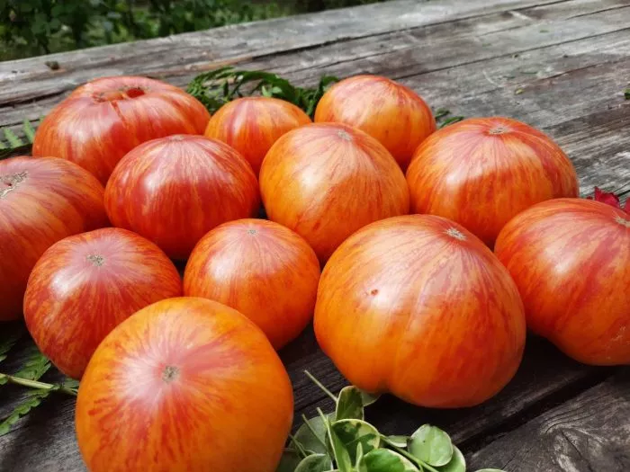 Главная особенность, выделяющая этот сорт среди сотен других, — эксклюзивная окраска плодов. Сочетание нежно-оранжевого фона с золотистыми разводами и розовыми полосками делает каждый помидор неповторимым произведением искусства. Эта сложная игра цвета не только визуально привлекательна, но и является маркером сортовой принадлежности.