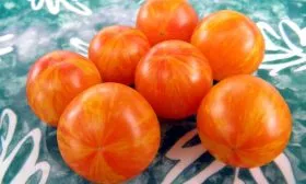 Плоды имеют классическую округлую форму, часто с легкой, едва заметной приплюснутостью у плодоножки. Их главная отличительная черта — уникальная окраска. В состоянии полной биологической спелости томаты приобретают насыщенный красный фон, по которому проходят четкие, контрастные продольные полосы солнечно-желтого цвета.