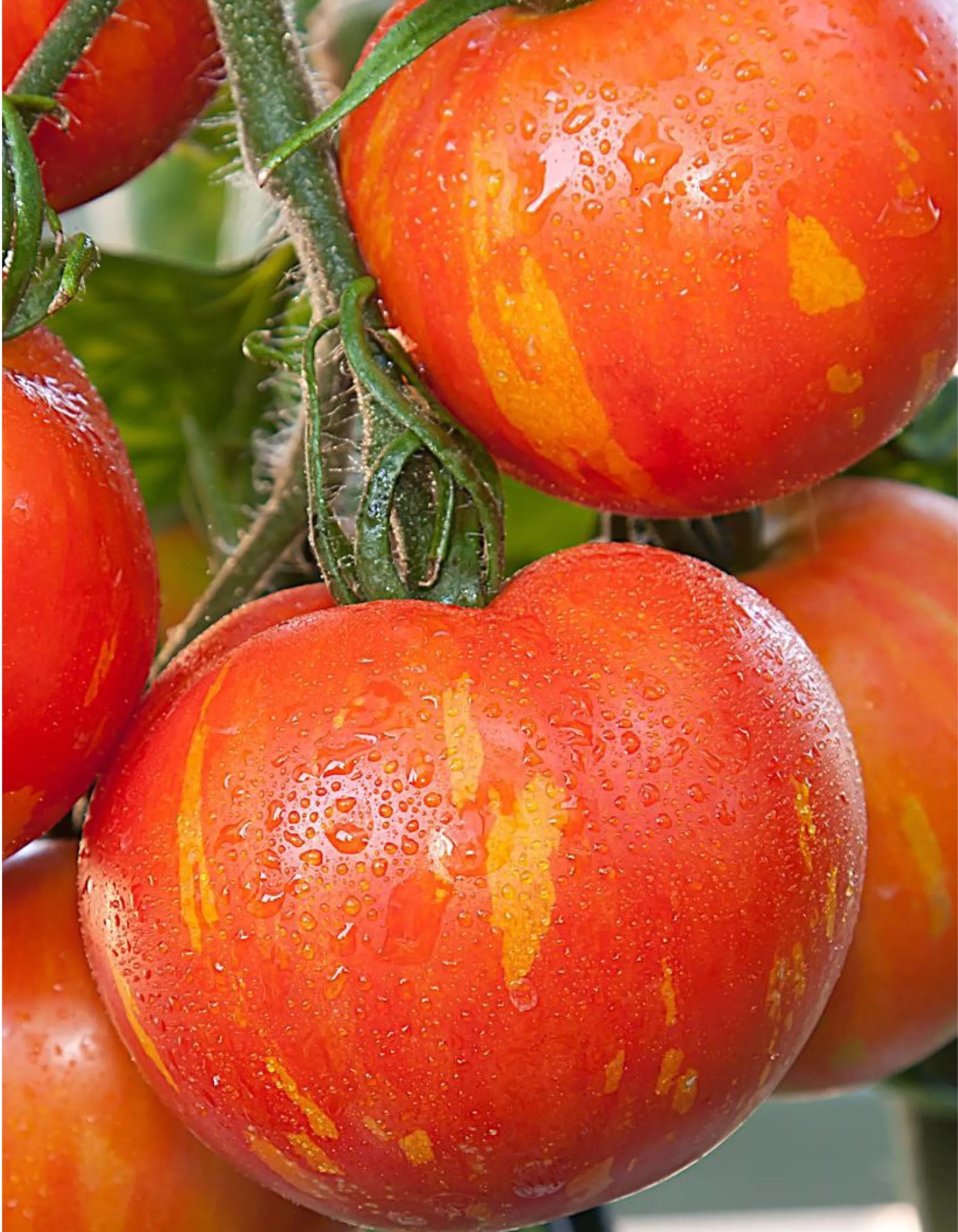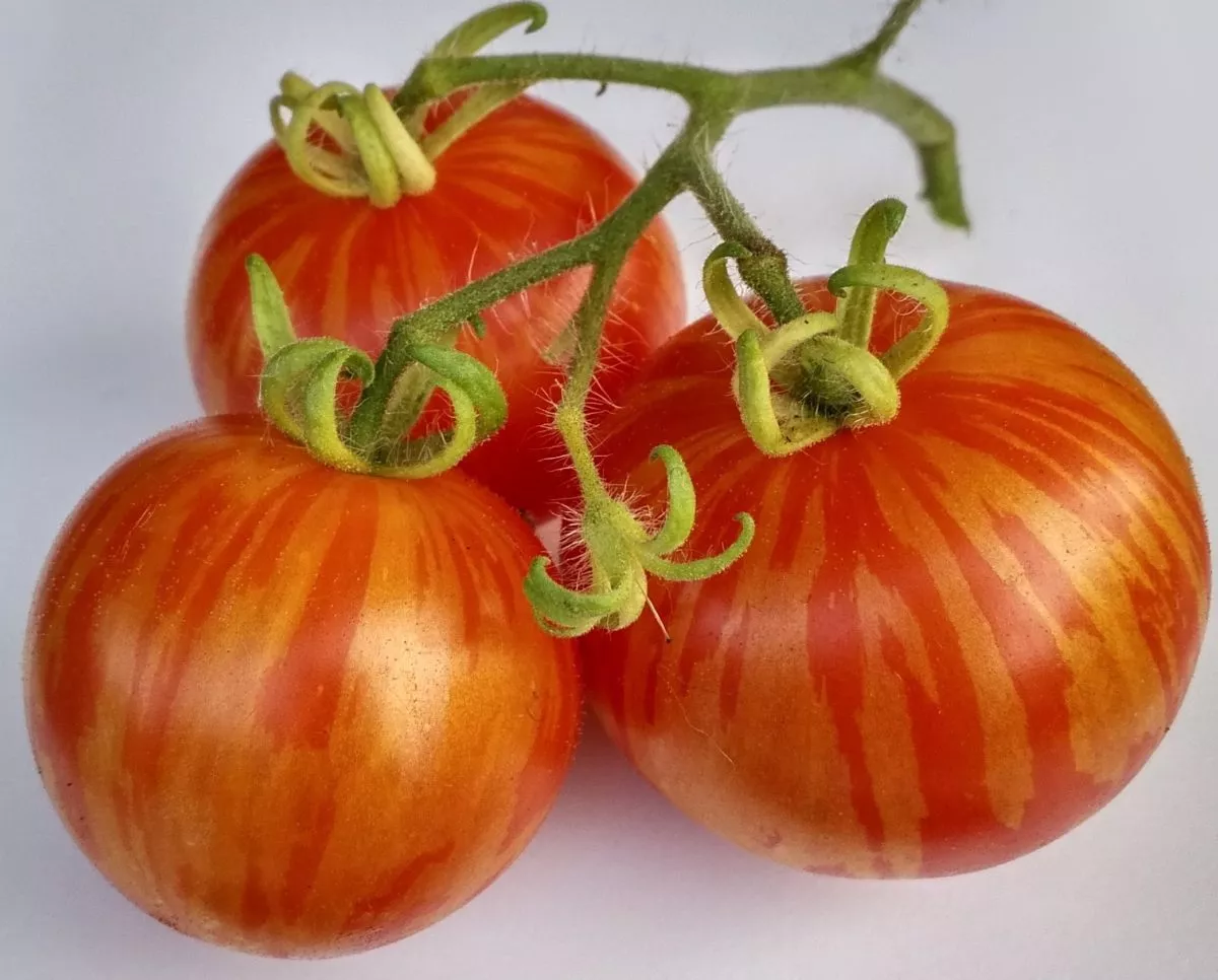Плоды имеют классическую округлую форму, часто с легкой, едва заметной приплюснутостью у плодоножки. Их главная отличительная черта — уникальная окраска. В состоянии полной биологической спелости томаты приобретают насыщенный красный фон, по которому проходят четкие, контрастные продольные полосы солнечно-желтого цвета.