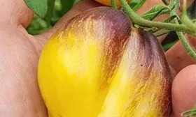 Сорт относится к категории биколоров (двуцветных томатов). Их отличительная черта — неоднородная окраска кожицы и мякоти, которая формируется за счет сложного сочетания пигментов. В данном случае это комбинация желтого фона и антоцианового напыления у плодоножки, интенсивность которого напрямую зависит от количества солнечного света.