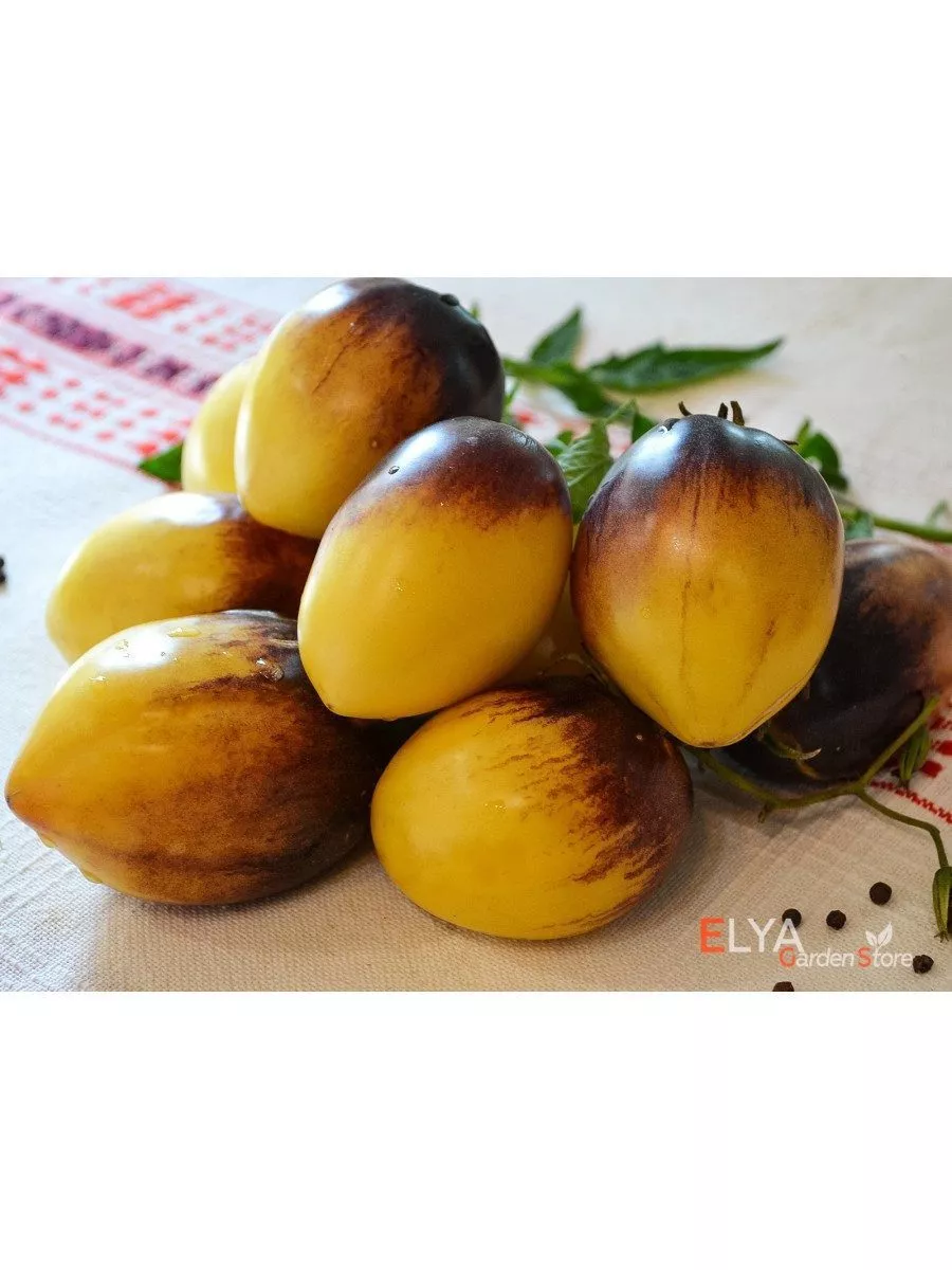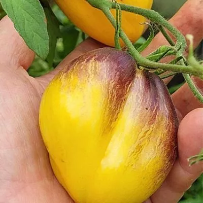Сорт относится к категории биколоров (двуцветных томатов). Их отличительная черта — неоднородная окраска кожицы и мякоти, которая формируется за счет сложного сочетания пигментов. В данном случае это комбинация желтого фона и антоцианового напыления у плодоножки, интенсивность которого напрямую зависит от количества солнечного света.