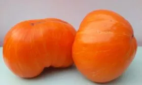 Форма плода плоскоокруглая, с часто выраженной ребристостью у плодоножки, которую в описаниях называют «пышными бочками». Полностью биологическая спелость наступает, когда плод размягчается, а контраст между желтым фоном и оранжевыми полосами становится максимально ярким. Такая пестрая окраска является сортовым признаком и проявляется только при полном созревании на кусте.