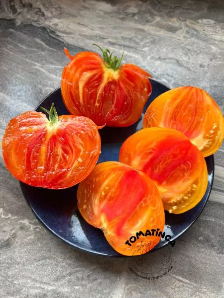 Форма плода плоскоокруглая, с часто выраженной ребристостью у плодоножки, которую в описаниях называют «пышными бочками». Полностью биологическая спелость наступает, когда плод размягчается, а контраст между желтым фоном и оранжевыми полосами становится максимально ярким. Такая пестрая окраска является сортовым признаком и проявляется только при полном созревании на кусте.