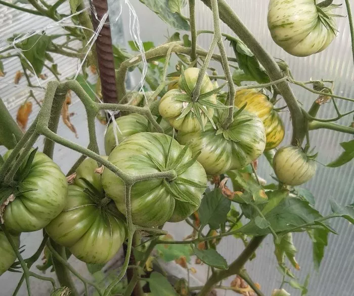 Плодоношение происходит на простых кистях. В первой кисти, как правило, завязывается 3-4 помидора, в последующих их количество может увеличиваться до 4-6. Учитывая совокупный вес такой кисти, которая может превышать 2 кг, подвязывать нужно не только основной стебель, но и сами тяжелые грозди, чтобы предотвратить отламывание.