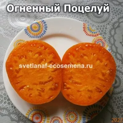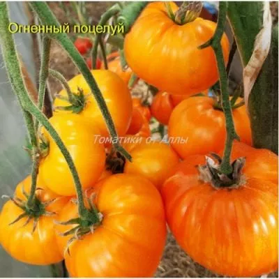 Название сорта «Огненный поцелуй» было дано не случайно. Оно является прямой отсылкой к уникальному внешнему виду зрелых томатов – их желтая кожица украшена яркими оранжевыми и красноватыми полосами, создающими эффект живого пламени. Вторую часть названия «поцелуй» можно трактовать как намёк на изысканный, фруктовый вкус, который отмечают дегустаторы.