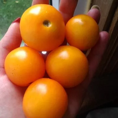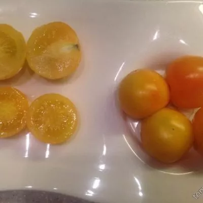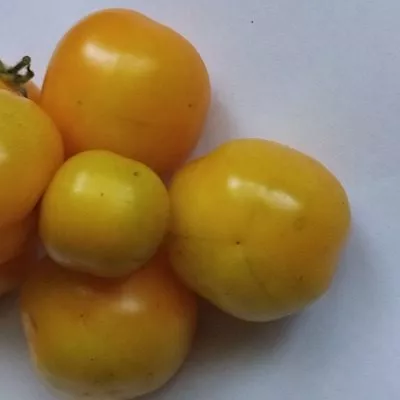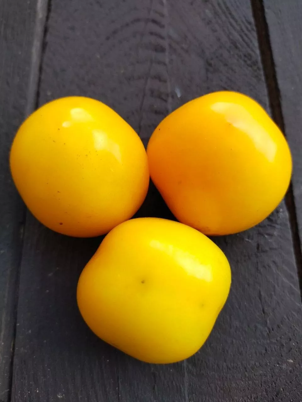 Плоды имеют выровненную, классическую округлую форму, соответствующую заявленным характеристикам. Их масса стабильна и обычно составляет 40-50 граммов. В фазе технической спелости томаты светло-зеленые, а при полном созревании равномерно окрашиваются в насыщенный солнечно-желтый цвет без какого-либо зеленого пятна у плодоножки.