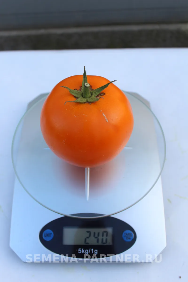 Зрелый плод приобретает насыщенный, равномерный ярко-оранжевый цвет, что напрямую связано с высоким содержанием бета-каротина. Средняя масса плода, согласно данным, колеблется от 230 до 280 граммов. Однако на нижних, первых кистях нередки более крупные экземпляры, что характерно для многих биф-томатов (крупноплодных сортов).