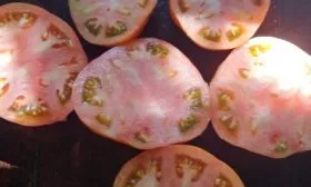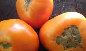 В фазе технической спелости окраска зеленая с характерным темно-зеленым пятном у плодоножки. При полном созревании плоды приобретают заявленный красно-желтый цвет. Мякоть плотная, мясистая и многокамерная, с высоким содержанием сухих веществ, что характерно для сортов, рекомендованных для консервации.