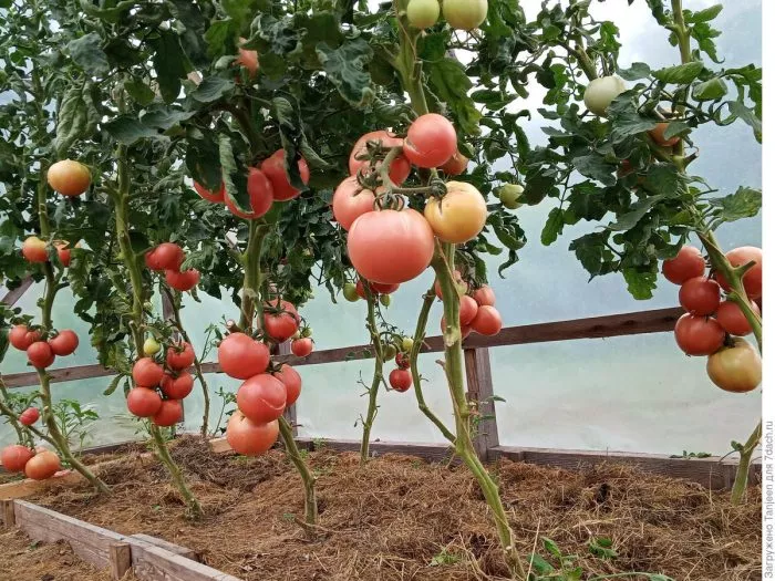 Сбор плодов этого сорта — продолжительный процесс, что напрямую связано с его индетерминантным типом роста и среднеспелостью. Новые кисти формируются и наливаются постепенно, поэтому уборку проводят выборочно, по мере созревания каждой грозди. Основное правило — дожидаться полной биологической спелости, когда томат равномерно окрашивается в характерный розовый цвет и легко отделяется от плодоножки. Именно в этот момент в мякоти накапливается оптимальный баланс сахаров и кислот, обеспечивающий заявленный отличный вкус.