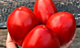 Плоды — главная отличительная черта сорта. Их форма является эталонной для категории «крупная сливка»: вытянутые, с выраженной «пухлостью» в средней части и характерным небольшим носиком на вершине. Они не склонны к мельчанию даже в верхних кистях, сохраняя внушительный размер.