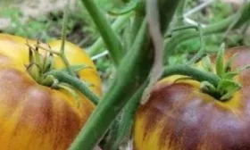 Главная отличительная черта сорта — локализованное проявление антоцианового пигмента. Антоцианы — это природные красители, которые у многих растений (например, у баклажанов или краснокочанной капусты) дают фиолетовые, синие или красные оттенки. У большинства антоциановых томатов окраска проявляется по всей кожице или в мякоти, создавая равномерный темный цвет.
