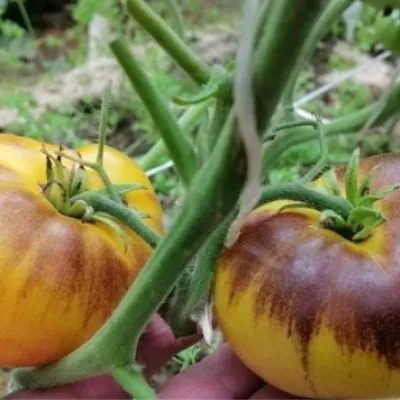 Главная отличительная черта сорта — локализованное проявление антоцианового пигмента. Антоцианы — это природные красители, которые у многих растений (например, у баклажанов или краснокочанной капусты) дают фиолетовые, синие или красные оттенки. У большинства антоциановых томатов окраска проявляется по всей кожице или в мякоти, создавая равномерный темный цвет.