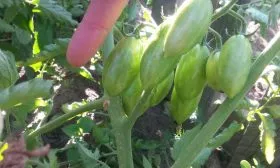 Плоды завязываются в простых кистях, обычно по 5-7 штук в каждой. Они имеют характерную удлиненно-овальную, «пальчиковую» форму, что и дало название сорту. В технической спелости томаты светло-зеленые, без темного пятна у плодоножки. По мере созревания равномерно окрашиваются в насыщенный красный цвет.