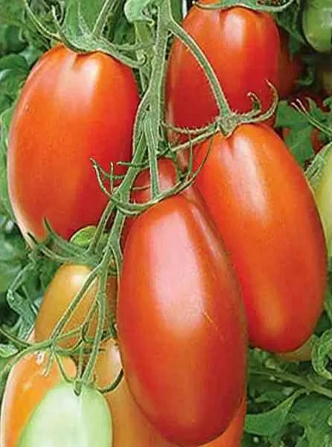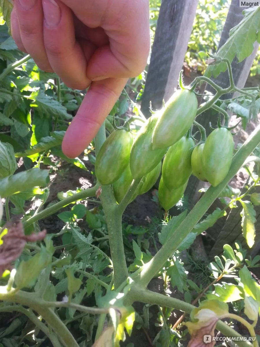 Плоды завязываются в простых кистях, обычно по 5-7 штук в каждой. Они имеют характерную удлиненно-овальную, «пальчиковую» форму, что и дало название сорту. В технической спелости томаты светло-зеленые, без темного пятна у плодоножки. По мере созревания равномерно окрашиваются в насыщенный красный цвет.