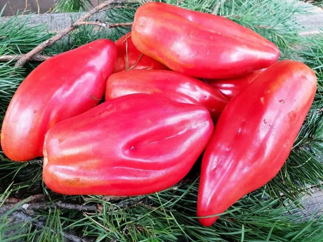 Плоды имеют цилиндрическую, вытянутую форму со слаборебристой поверхностью у основания и характерным заостренным «носиком». Эта форма, напоминающая болгарский перец, и дала название всей линейке «перцевидных» томатов. Средняя масса одного плода составляет от 80 до 120 граммов.