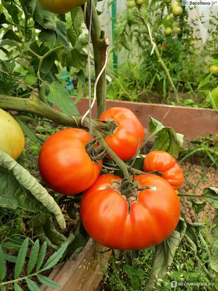 Высокорослый куст с тяжелыми кистями, каждая из которых может нести несколько плодов массой от 124 граммов и более, физически не может стоять без опоры. Подвязку начинают практически сразу после высадки рассады.