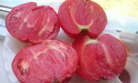 Цвет зрелого томата — насыщенный розовый (малиновый), без зеленого или желтого пятна у плодоножки. Мякоть мясистая, сахаристая на изломе, многокамерная. Вкус описывается как гармоничное сочетание кислого и сладкого, что характерно для многих розовоплодных томатов, обладающих, как правило, более высоким содержанием сахаров и нежной консистенцией по сравнению с красноплодными.