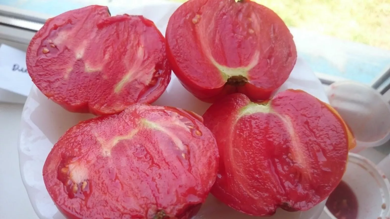 Цвет зрелого томата — насыщенный розовый (малиновый), без зеленого или желтого пятна у плодоножки. Мякоть мясистая, сахаристая на изломе, многокамерная. Вкус описывается как гармоничное сочетание кислого и сладкого, что характерно для многих розовоплодных томатов, обладающих, как правило, более высоким содержанием сахаров и нежной консистенцией по сравнению с красноплодными.