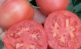 Окрашивание происходит равномерно: в фазе полной зрелости плод приобретает насыщенный розовый цвет без зеленого пятна у плодоножки. Мякоть многокамерная, сочная, но при этом плотная и мясистая (сахаристая на изломе), что является отличительным признаком качественных розовых томатов.
