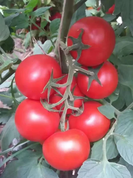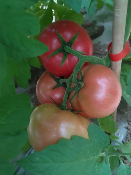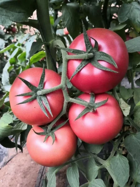 Главная гордость гибрида — его плоды. Они завязываются в кистях по 4-6 штук. Форма округлая, часто с заметной приплюснутостью у плодоножки. Зрелый томат имеет насыщенный розовый, почти малиновый цвет без зеленого пятна у плодоножки, что говорит о полной спелости.