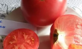 Плоды имеют стабильно округлую, слаборебристую форму и выраженную многокамерность. Их ключевая отличительная черта — равномерный розовый окрас без зеленого пятна у плодоножки в стадии полной биологической зрелости. Это признак качественного гибрида, указывающий на полноценное созревание и накопление сахаров.
