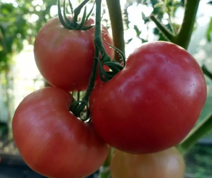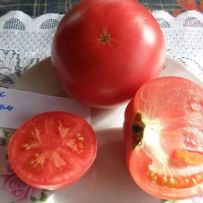 Плоды имеют стабильно округлую, слаборебристую форму и выраженную многокамерность. Их ключевая отличительная черта — равномерный розовый окрас без зеленого пятна у плодоножки в стадии полной биологической зрелости. Это признак качественного гибрида, указывающий на полноценное созревание и накопление сахаров.