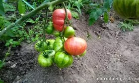 Главная отличительная черта «Полосатых щечек» – это, конечно, плоды. Их форма классифицируется как плоскоокруглая, с заметной приплюснутостью сверху и снизу. Плоды не просто крупные, а выровненные, со средней массой 230-280 граммов. Такие размеры требуют от растения много ресурсов и надежной поддержки, так как кисти под их тяжестью могут обламываться.