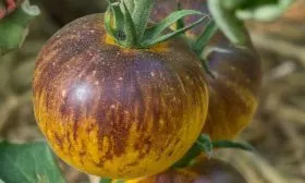 Этот томат обладает настолько выразительной внешностью, что его легко узнать даже среди других биколоров. Его главная отличительная черта — уникальная, «художественная» окраска спелых плодов. Основной фон созревает до яркого, солнечно-желтого цвета. От области у плодоножки, так называемых плечиков, расходятся насыщенные фиолетово-черные полосы и разводы.