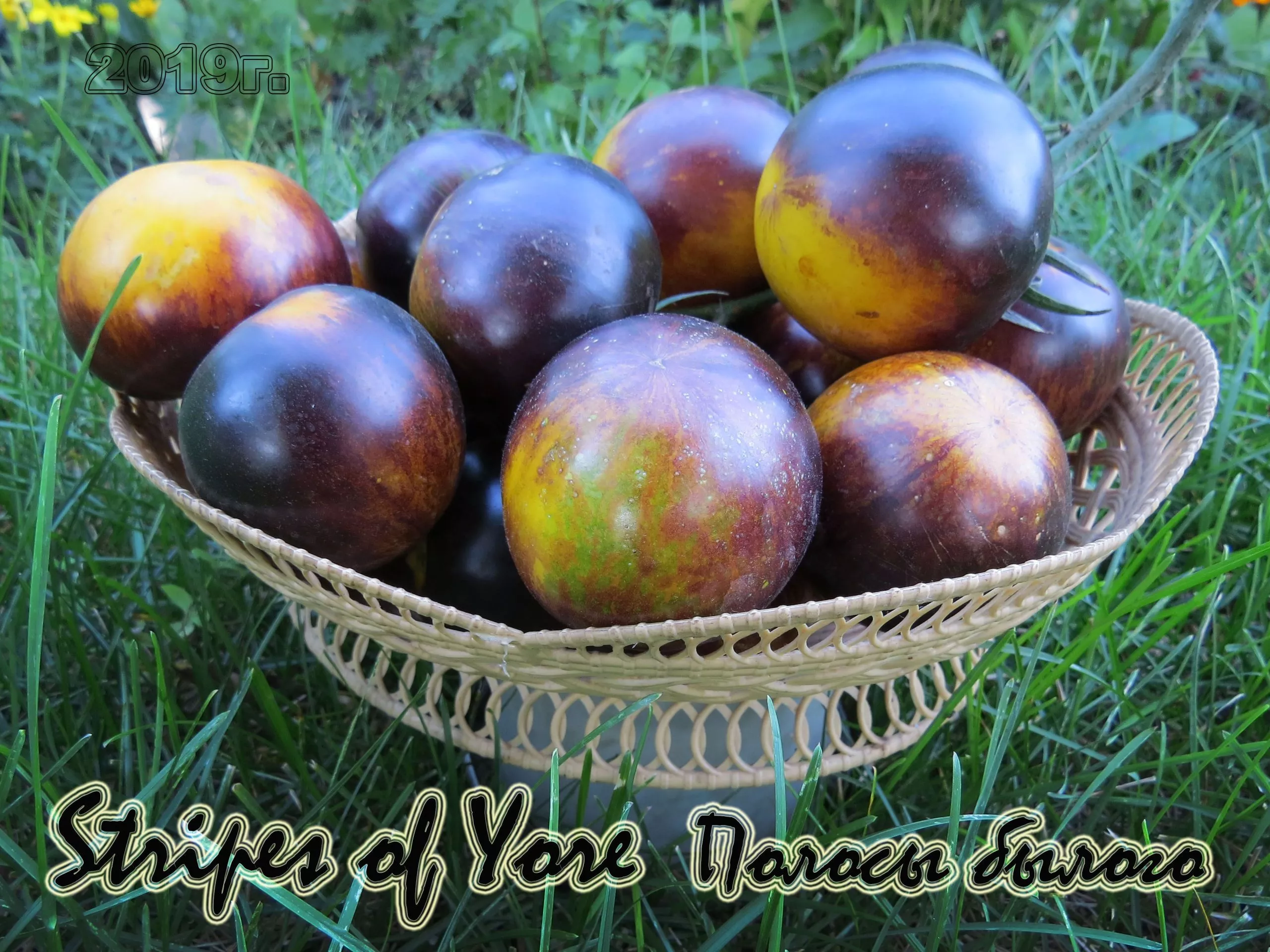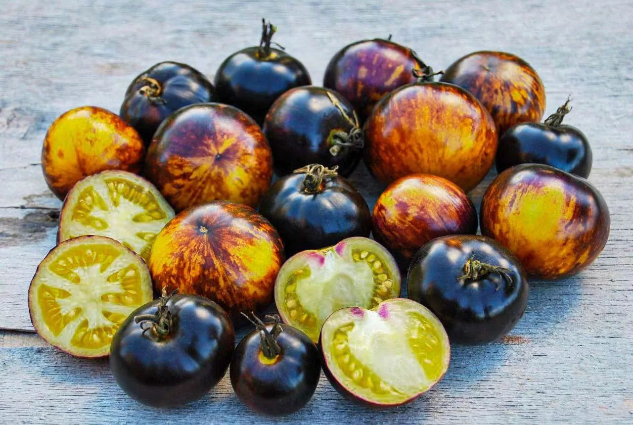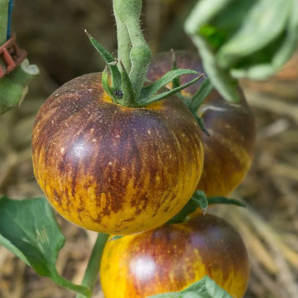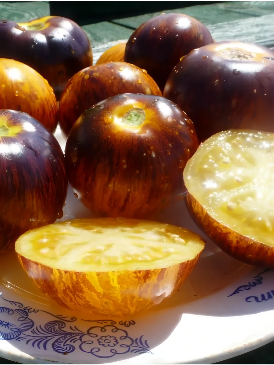 Этот томат обладает настолько выразительной внешностью, что его легко узнать даже среди других биколоров. Его главная отличительная черта — уникальная, «художественная» окраска спелых плодов. Основной фон созревает до яркого, солнечно-желтого цвета. От области у плодоножки, так называемых плечиков, расходятся насыщенные фиолетово-черные полосы и разводы.
